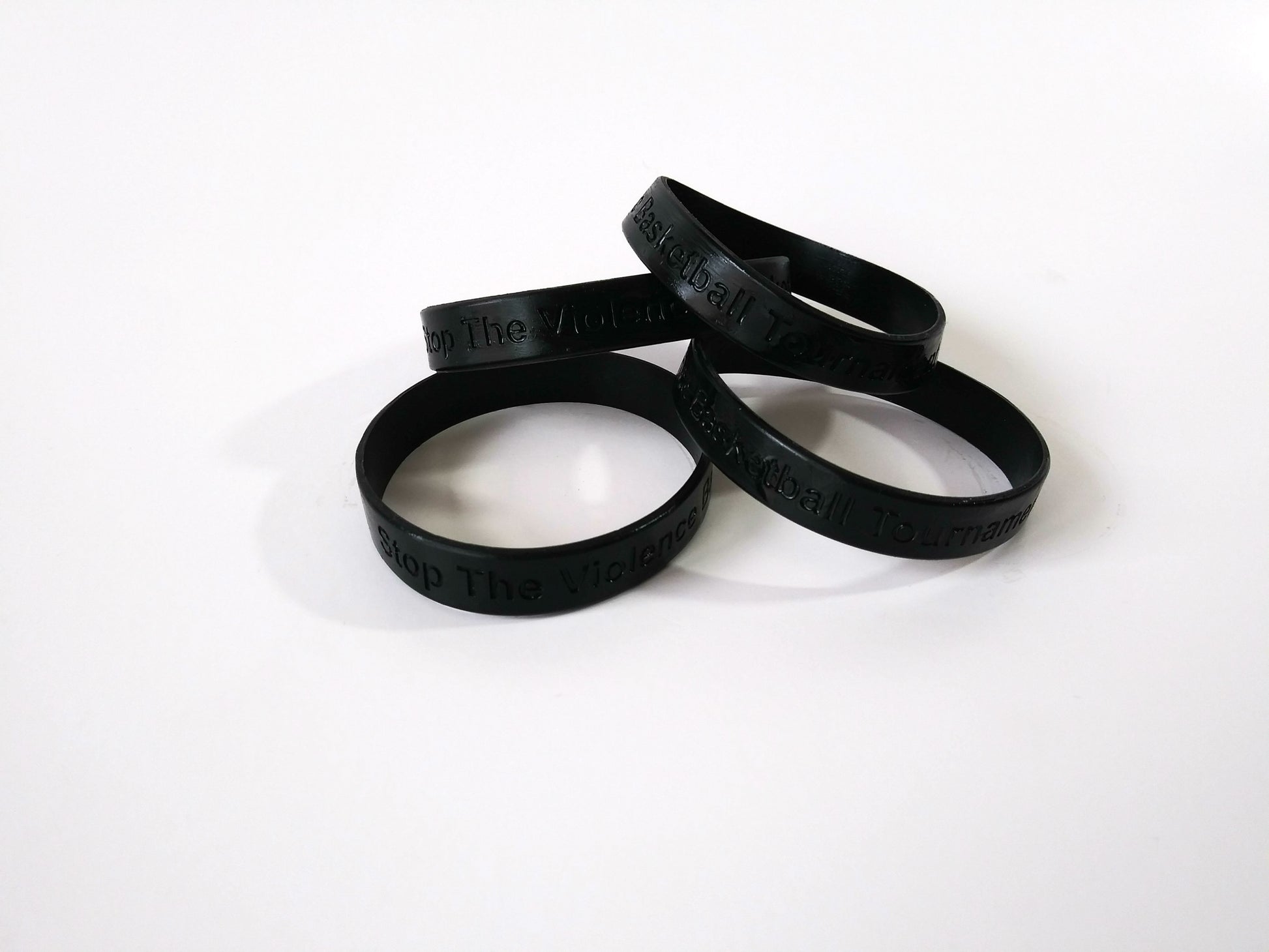 This is our Stop The Violence Basketball Tournament® wrist bands. The material is silicon. They have our name debossed on them that says: Stop The Violence Basketball Tournament®. They come in 4 colors: Black, Yellow, Purple and Burgundy. The size is for adult wrist